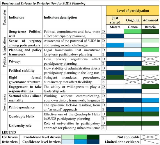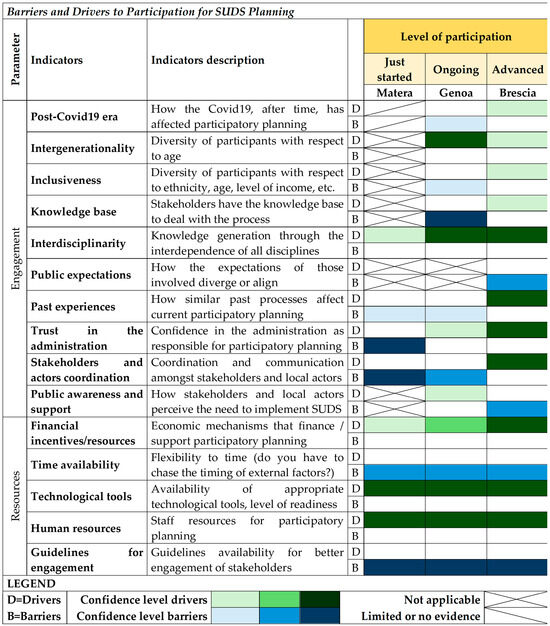 Based on the literature analysis reported in Table 1, a matrix of barriers/drivers to participation in SUD planning is developed and illustrated in Figure 8 and Figure 9. The proposed 26 indicators to assess drivers and barriers include both indicators from the literature (already assessed in previous studies) and innovative (specifically identified in this study) indicators. The proposed indicators are organized into the following evaluation parameters: policy and legislation, governance, involvement, and resources. In the developed barrier–driver matrix, each proposed indicator is analysed for the level of participation (just started, ongoing, and advanced) corresponding to the case study (respectively, Matera, Genoa, and Brescia) and with respect to three levels of confidence (low, medium, and high) reported in the matrix, respectively, as light, normal, and dark colours. Figure 8 reports the developed matrix of barriers to (B) and drivers of (D) participation in SUD planning for the policy and legislation and governance parameters. Figure 9, similarly to Figure 8, reports the developed matrix of barriers to/drivers of participation in SUD planning for the following parameters: engagement and resources. The innovative indicators depicted in this study are: quadruple helix, university role, post-COVID19 era, intergenerationality, interdisciplinarity, trust in administration, and technological tools. Concerning the university role indicator, a certain pressure on universities to pair teaching and performing research with providing contribution to communities and territories, known as the third mission, has recently been observed [60]. Globally, major barriers identified in the three case studies include sectoral silos or a siloed mentality, path dependence, limited time availability, and a lack of guidelines for engaging local actors. On the other hand, drivers encompass the quadruple helix model, the involvement of universities, interdisciplinary approaches, dedicated financial incentives and resources, as well as the utilization of technological tools and human resources.