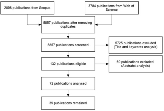 The steps followed during the application of the PRISMA methodology are described in Figure 2. After identifying the publications according to the restrictions, the first step was to remove the duplicate results found in the two databases. In this step, the 25 identified duplicate results were removed. The remaining 5857 publications were screened by analysing their title and keywords, and 5725 were removed during this step. The remaining 132 publication abstracts were analysed, and 60 publications were excluded. The remaining 72 publications were fully analysed, and in 39 of them, PMS frameworks or models were identified.