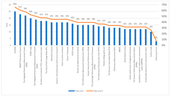 After the classification process was completed (Figure 3), it became evident that only four out of the 28 PMSs assessed had achieved a score exceeding half of the highest possible classification (38 points). These distinguished PMSs are (i) ECOGRAI, (ii) Performance Pyramid, (iii) Integrated Performance and Measurement System (IPMS), and (iv) European Foundation for Quality Management (EFQM) model with scores of 66%, 61%, 58%, and 53%, respectively. On the other hand, seven PMSs failed to attain even one-third of the highest possible classification, as can be observed in Figure 3.