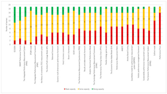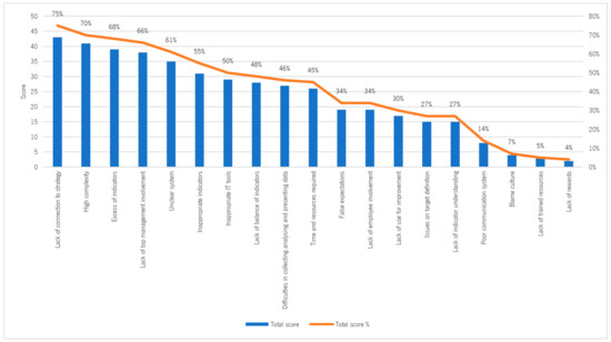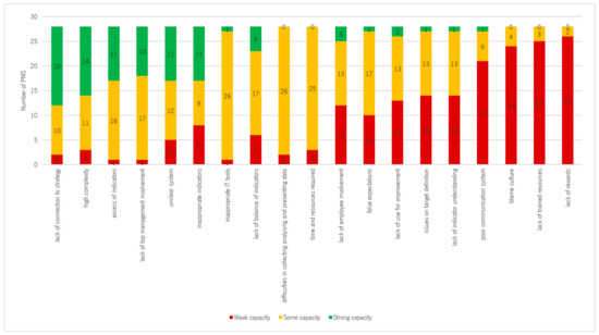 The barriers (Table 1) with the highest scores in terms of the capacity of the PMSs to address them were the lack of connection to strategy, high complexity, and excess of indicators, registering percentages of 75%, 70%, and 68%, respectively. On the other hand, the barriers with the lowest scores were poor communication system, blame culture, lack of trained resources, and lack of rewards, as can be observed in Figure 5.
