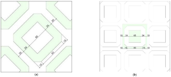The urban planning of Barcelona is of a chessboard layout [7]. The square street network rotates 45 degrees from the north–south direction and the density is 133.3 m. Influenced by the “livable street” concept, Barcelona created an urban planning strategy in 1987 to form a super block with nine small blocks, and the side length of the super block is 400 m to meet the requirements of pedestrian comfort (Kaihuai Liao, 2018) [8]. The street around the super block is usually 24 m wide. The street around the residential area is usually 20 m wide, and both directions of the corner are chamfered to form a corner square (Figure 1 and Figure 2). The size of the block building is 113.3 m squared. The building had five floors in the early stage of Celda’s design. With the increase in population, it has evolved into seven, even nine, floors with a platform on the top [9]. Thanks to the usage of a patio for ventilation and lighting, the depth of the building can reach 24 m or even 30 m. In terms of function, the bottom layer along the street is commercial, and the upper layer is used for residence.