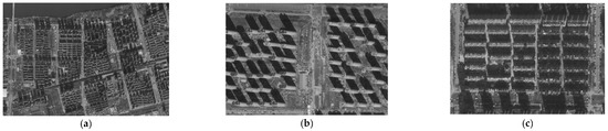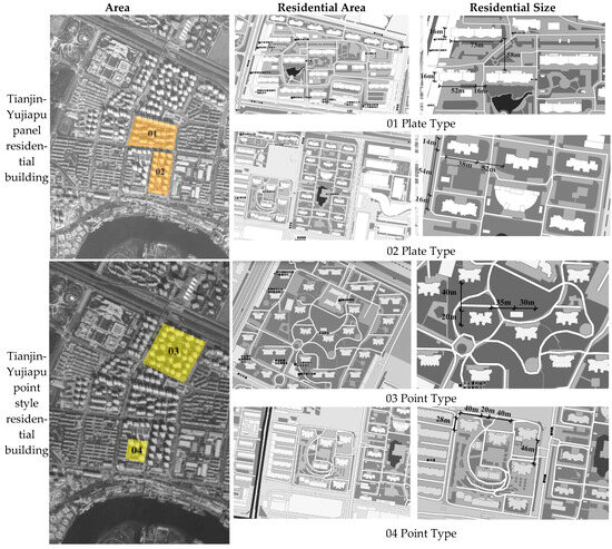 The block size of residential areas in northern Chinese cities (Figure 3 and Figure 4) is about 250 m squared, and the street width varies from 20 m to 40 m with the streets’ rank, with some parts of the area showing the characteristics of a huge street layout [10]. Residences often use point type or slab type with a north–south direction to form low FAR communities and rarely have an east–west layout [11]. In terms of residential scale, according to the “urban residential area planning and design code” issued in 2018, the maximum height of residential buildings is under 80 m, and the FAR should be below 3.1. As patios are not allowed to be used, the depth of residential buildings with ventilation on both sides is usually five times their height, therefore 15 m. In terms of function, business and retail will be designed separately or along the street, and the community generally has a residential function.