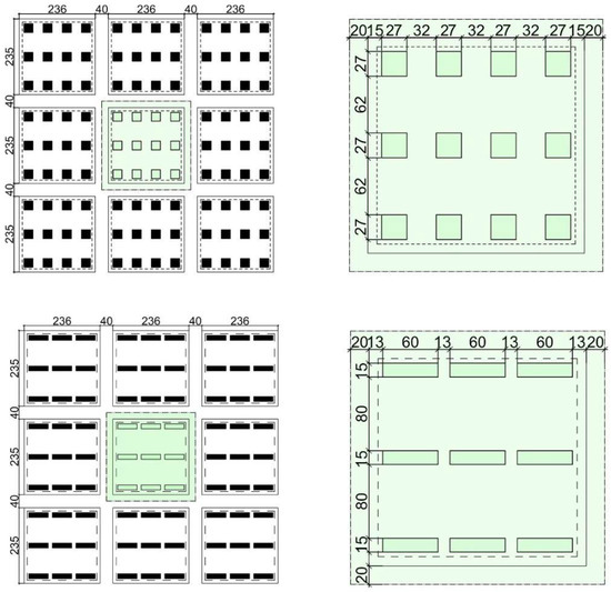 The test model of northern Chinese cities uses slab type (model T1) or point type (model T3). The slab plan adopts a size of 15 × 60 m, and the height is 50 m. The point plan adopts a size of 25 × 25 m, and the height is 77 m. The FAR of the slab model is 2.6, and that of point model is 4.06. The surrounding shading model has the same scale as the test model (Figure 5 and Figure 6).