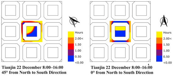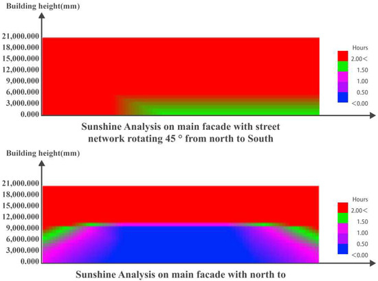 According to the existing sunshine standard in northern Chinese cities, residences require more than two hours of full window sunshine on the coldest day [26]. In the test, the data of sunshine satisfying two hours, between one hour and two hours, and less than half an hour are recorded, with two hours of sunshine as the main reference, one to two hours as supplementary sunshine, and less than half an hour as the areas with unfavorable sunshine.