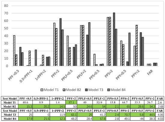 When FAR is less than 3.1, which is in line with Chinese code, the optimized Barcelona test model (model B1) has appreciable advantages in the building façade, the lower part of the building façade, and the courtyard. Two different layouts’ proportion of probes whose sunlight hours is greater than 2 h both exceeded 50%. In the meantime, Barcelona’s preference is superior to that of the northern Chinese cities in PPF < 0.5, PPF ∈ [0.5,1), PPF ∈ [1,2), which indicates that there is more additional sunlight in the inferior part of the façade and Barcelona’s façades obtain more evenly distributed sunshine.