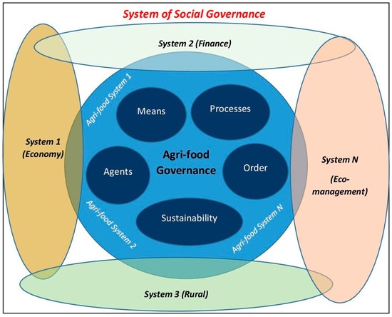 The agri-food governance system is a part (subsystem) of the social governance system and other important governance systems, such as the economy, rural or urban, ecosystem, and energy systems (Figure 1). The relationships of agri-food governance with other social systems largely (pre) determine its type and logic of development [24]. On the other hand, agri-food governance consists of different governance subsystems, differentiated depending on the type of agri-food system (farming, food processing, food distribution, and food consumption), type of product (plant, livestock, and wine), the type of resources (land, water, and finance), the functional area (inputs supply, innovation, marketing, and risk management), geographical and administrative region (rural, urban, ecosystem, sector, national, transnational, European, and global). All of them have to be studied to highlight their specificity and role in the development of agri-food governance in general.