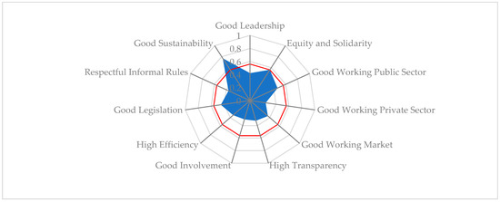 Quality of governance of Bulgarian agriculture for good governance principles. Blue line is the actual level of the quality of governance, while red line is the border for the good quality governance.