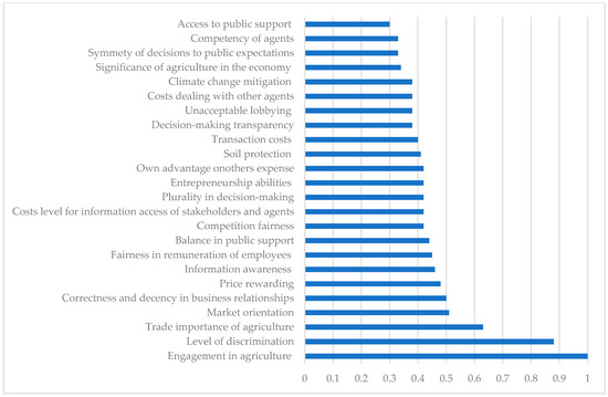 In the new institutional economics method, there is always some (a good or a bad) governance, and depending on the efficiency and the quality of the specific governance different countries, communities, industries, and regions archive dissimilar results in socioeconomic and environmentally sustainable development [24]. Consequently, a comprehensive assessment of the quality of governance becomes an important part of the agri-food governance analysis. In addition, quality refers to all components of the governance system—the quality of governing agents, governance means, governing processes, governance order, and the system’s sustainability.