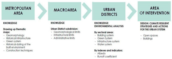 To provide the responses to climate adaptation and mitigation goals in the study case, it was necessary to identify adequate climate-resilient technical solutions at different scales. Based on the analyses at the urban scale carried out in the first phase, the following strategies have been developed at the district scale (Piscinola-Miano and Scampia) (Figure 5):