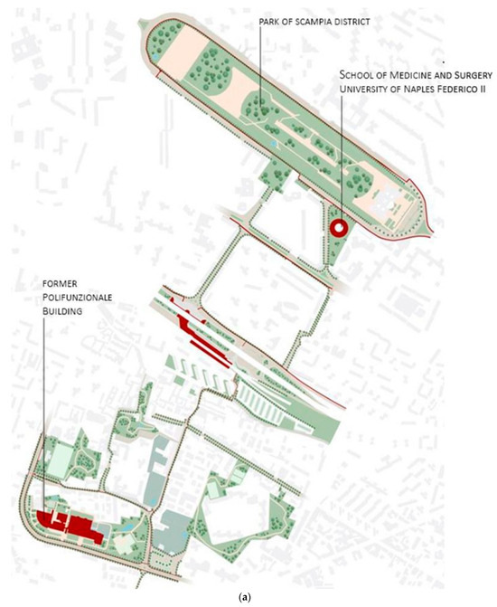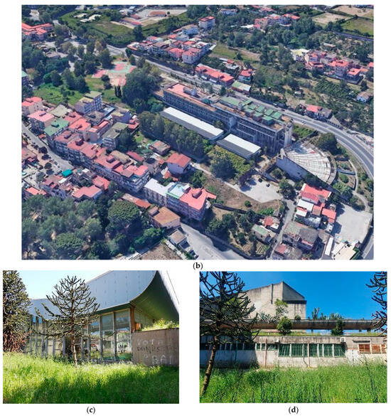 The study area is located in the Piscinola district in the northen area of Naples. This area is characterized by a relevant green system of parks (the Scampia Park and the Capodimonte Park), the natural system of Vallone di San Rocco, and rural green areas. The building–outdoor space system to be tested in the second phase of the study is identified in the former Centro Polifunzionale Marianella (Figure 2), characterized by an uneven building fabric with low thermal performances and many open spaces, but lacking in outdoor comfort conditions, and by a green system that is poorly interconnected and ineffective with regard to climate-proofing. The building, designed in the 1980s by the architect Gerardo Mazziotti, has several characteristics of authorship as well as architectural quality, due to the original design, as it was inspired by the Corbusian principles of the modulor, the golden section, and the roof garden. Today, the building shows technical and functional deterioration and energy performance decay.