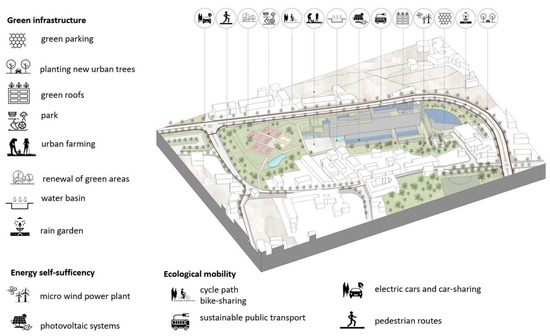 To obtain measurable results, it was necessary to make a shift from the district and strategic scale to the more operative one of the building–system outdoor space, where these strategic lines have been detailed focusing on three main aspects: water-sensitive management, sustainable management of green areas, and self-production of energy from renewable sources (Figure 5).