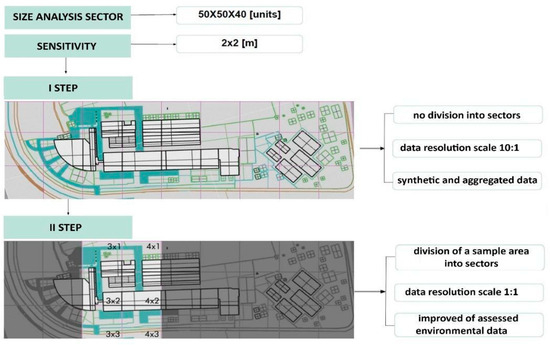Modeling phase and model resolution for simulation. To use the open-source version of the microclimate simulation software, it is necessary to divide the area into sectors. The figure depicts the two stages of the modeling phase. In the initial stage, the entire analysis area underwent geometric simplifications, omitting details that would not be discerned by the simulation software at a 10:1 scale. In the second stage, achieving a 1:1 resolution, the area was divided into uniform 50 × 50 sectors. In selected sectors, the modeling accurately replicated the real conditions of outdoor spaces.