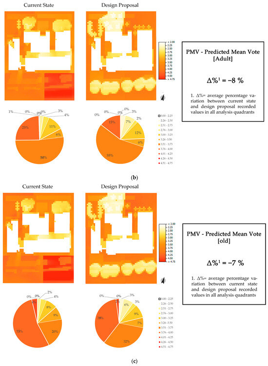 The average percentage variation was calculated based on the final mean of the results obtained for each quadrant. The process was repeated for each selected environmental parameter. The microclimatic simulations showed (Figure 8), for both models, an average 8% reduction in PMV values for adult and an average 7% reduction for ageing people. Similar results can be observed for the mean radiant temperature values, with a 6% reduction for the design proposal scenario. These values demonstrate an overall improvement in outdoor thermo-hygrometric comfort conditions. This is further confirmed by the 6% reduction (corresponding to about 2 °C) of the potential air temperature and surface temperature values. The design solutions for climate mitigation are less effective, resulting in an average reduction of only 1% between the actual state and the proposed project.