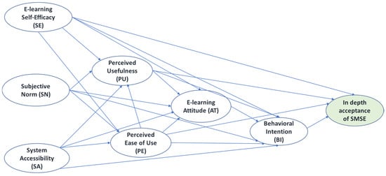 In the survey, 22 questions were aligned to the TAM questionnaire [26,27]. The questionnaire was focused on the main factors that encourage the acceptance of the suggested e-learning approach, which assumes the application of the SMSE, such as Perceived Ease of Use (PE), Perceived Usefulness (PU), Attitude (AT), Behavioral Intention (BI), E-learning Self-Efficacy (SE), Subjective Norm (SN), and System Accessibility (SA).