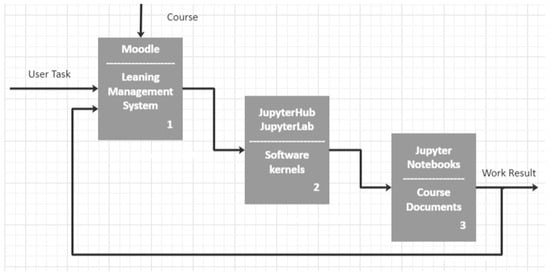 However, such issues can be resolved with relative ease by deploying an institution-wide virtualized solution that would provide users with on-demand, pre-packaged workspaces that could be accessed individually [14]. Additionally, this approach also ensures that all course participants have access to a homogeneous educational and working environment, thereby preventing the infamous “It works on my computer” issue from occurring. While the desired result may be archived in multiple ways, the Jupyter project [15] presents the solution with benefits such as scalability, modular design, a mature and rich ecosystem, a web-based user-facing interface and the ability to combine lecture material and runnable examples in a single Jupyter Notebook. So, the combination of Moodle and Jupyter platforms in one integrated technological solution would create the prerequisites for reaching the level of the Digital Learning Ecosystem (DLE), which, according to [16], is the most high-quality and effective form of teaching and learning in a period of instability associated with pandemics such as COVID-19, but also military conflicts, one might add.
