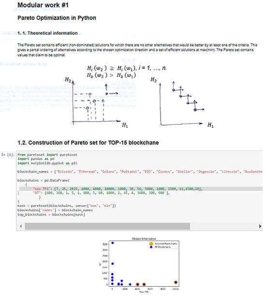 Course Documents. This component contains the texts of laboratory works with code in programming languages, which are executed using the corresponding software kernels. Since the basic format of laboratory works is Jupyter Notebook, this document combines both textual and graphical information, as well as mathematical formulas, multimedia and links to external resources. But most importantly, Jupyter Notebook is able to include examples of program code that can be executed by running it directly from this document. Jupyter Notebook is an example of an interactive training course. The SMSE ensures the implementation of this course in the user’s personal virtual laboratory. An example of a document in the Jupyter Notebook format is shown in Figure 4.