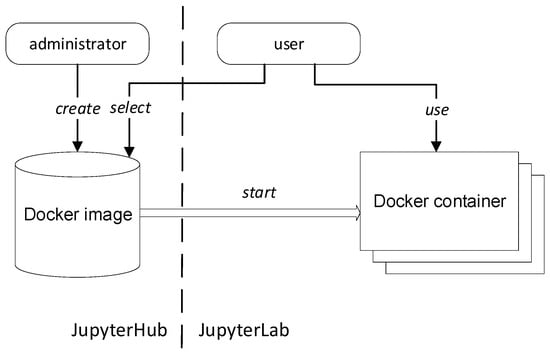 In SMSE, Jupyter Notebook documents are launched for execution on the JupyterLab virtual server, which runs the software kernels [30] and provides additional tools for the execution of program code directly from Jupyter Notebook documents. To support multilanguage examples of code within a single course, the SMSE uses Docker technology [31] to run on virtual server-separated resources instead of directly using the virtual machines on the operating system. The scheme of using Docker tools in SMSE is presented in Figure 5.