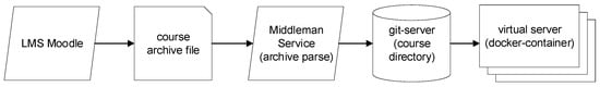 Using the Middleman Service and an intermediate Git server enables a reduction in traffic between Moodle and JupyterLab. Files from the Git server are automatically fetched when the user’s virtual server is started in JupyterHub. The scheme of the course file migration in the SMSE is shown in Figure 6.