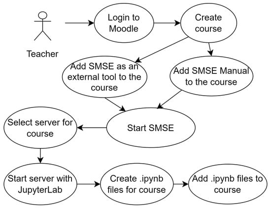 The main task of the SMSE is to support, in an online mode, the individual work of students with the course materials (lectures, practical or laboratory works) stored in Moodle. This possibility is provided by the use of remote laboratories with pre-installed software kernels that are created after running the virtual server related to a course. As actors in this process are both a teacher and a student, their use case diagrams are presented in Figure 7 and Figure 8, respectively.