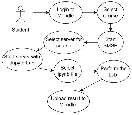 The development of the SMSE was preceded by the study of the experience of using Jupyter Notebooks in pedagogical practice [22,23], the organization of computer-cognitive laboratories [24] and the creation of the interface of virtual JupyterLabs [25]. Considering the already existing practice of using the Moodle LMS, the issue of the integration of the above-mentioned features of the Jupiter platform into the existing and created educational content was successfully resolved. Further, thanks to the efforts of all project partners in testing, the use of the SMSE in the educational process became a prototype of an educational ecosystem for practical modeling of cyber-physical systems for innovative physical-mathematical and engineering topics [21]. Integration with Moodle contributed to the transformation of the primary focus of the project into modeling tasks for other educational courses studied at universities. This became a good opportunity to consider SMSE as a general approach to distance learning within the framework of the future DLE.