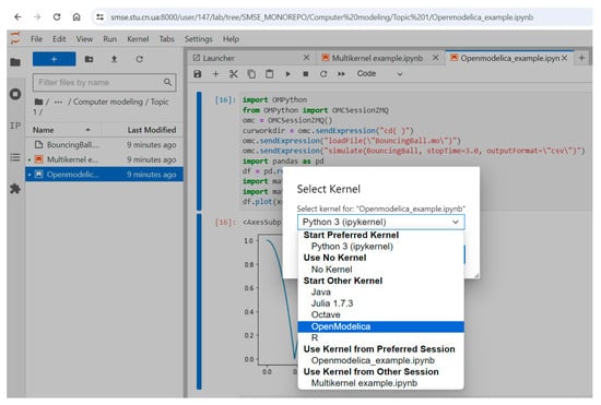 After starting the selected server, the course materials, represented in the form of Jupyter Notebook, are automatically loaded into the user’s JupyterLab in the appropriate sections of the course. Also, all the software kernels of the running server become available in JupyterLab. Combining cells with text information in Markdown format, formulas in LaTex format and code in Code format, the teacher creates the educational content of the corresponding lesson as a Jupyter Notebook document. The code examples can be run directly from this document by previously selecting the desired kernel using the menu. The general view of the JupyterLab page of the multi-kernel notebook server for the Computer Modeling course is shown in Figure 10.