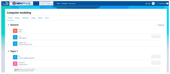 The student’s actions in using SMSE are rather similar to the teacher’s actions. When launching SMSE from the Moodle course, the student selects the recommended server, and after starting their JupyterLab, they can open the required Jupyter Notebook for studying, editing and saving the result of the processing task in the Jupyter Notebook format in their working directory for further uploading to Moodle in the corresponding section with the results of the completed work. It should be noted that the saving of all users’ achievements in the working directory of JupyterLab for further use is because each time JupyterLab is started, the course files are updated to their current state in Moodle. The general view of the Moodle course with built-in SMSE resources is shown in Figure 11.