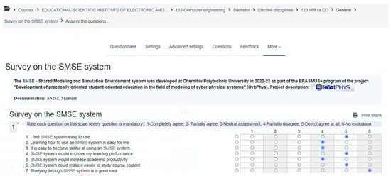 The integration of SMSE with Moodle not only enables flexible management of user accounts and course content, but also allows the use of other Moodle options for the assessment of students’ results and monitoring their progress. Also, it allows the use of questionnaires to obtain students’ feedback for improving the learning environment. Figure 12 shows an example of filling out a questionnaire regarding the usefulness of SMSE in the educational process.