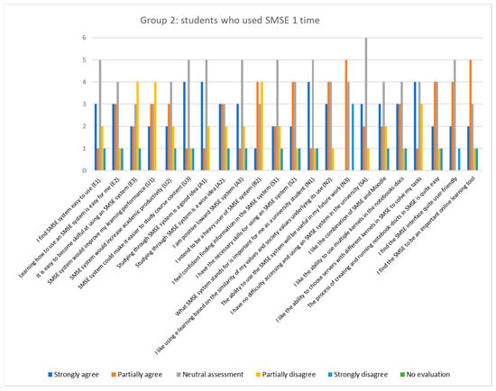 As mentioned in Section 3, “Materials and Methods”, we asked 22 questions aligned to the TAM questionnaire aiming to identify the main factors that encourage the acceptance of the suggested e-learning approach, which assumes the application of the SMSE. Figure 13 depicts the answers of students from Group 1 who regularly used the SMSE (a histogram of cumulative results). On the other hand, Figure 14 depicts the answers of students from Group 2, who recently started to use the SMSE (a histogram of cumulative results).
