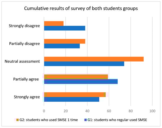 To understand how much the perception of students in both groups differs and what the trend is in changing their minds, we analyzed the answers of both groups in five categories: “Strongly agree”, “Partially agree”, “Neutral assessment”, “Partially disagree” and “Strongly disagree”. The summary of answers is depicted in Figure 15, “Cumulative results of a survey of both students’ groups”, which shows the number of answers in each of these five categories.