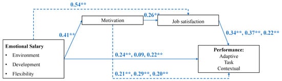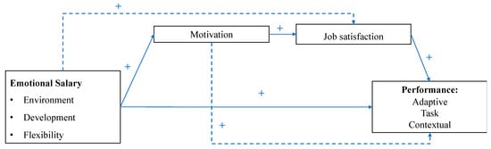 Emotional salary has a positive relation with (a) adaptive, (b) task, and (c) contextual performance through the mediation of motivation and, consequently, through job satisfaction (see Figure 1).