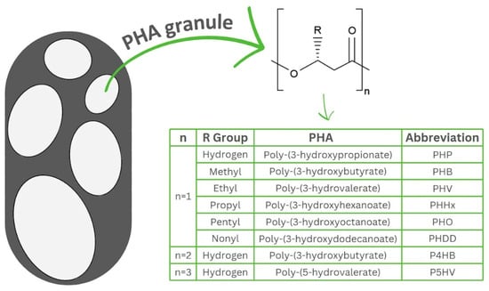 PHAs are biodegradable and biocompatible thermoplastics, soluble in chlorinated solvents, insoluble in water and resistant to hydrolytic attack and UV [35]. These biopolymers are polymerised polyoxoesters of polyesters of hydroxyalkanoates synthesised intracellularly by a wide range of microorganisms in the form of granules, with diameters ranging between 0.2 and 0.5 µm (Figure 1) [10,36,37]. The physical and chemical properties of PHAs, such as melting point, crystallinity, hydrophobicity, etc., differ significantly depending on the composition of the monomers [38]. PHAs also have a wide range of mechanical characteristics which vary from hard to elastic thermoplastics according to the type of feedstock, microbial host and fermentation strategy [38,39,40].