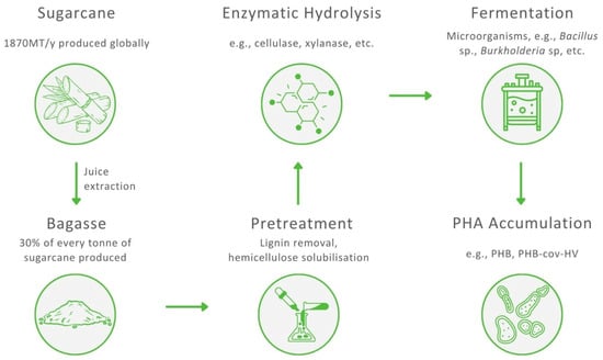 Transforming complex polysaccharides into fermentable sugars is one of the major challenges in the use of SCB as a feedstock to produce PHAs and requires two essential steps: pretreatment and hydrolysis. After hydrolysis, monomeric sugars are fermented by PHA-accumulating bacteria. The pretreatment of SCB is required for the removal of lignin, decrystallisation of glucose and partial depolymerisation of hemicellulose to increase the porosity of bagasse and facilitate the access of enzymes during the hydrolysis step [73]. Consequently, both polysaccharides, cellulose and hemicellulose, can be hydrolysed to monosaccharides, making SCB a potential raw material for the biosynthesis of PHA. Generally, a biorefinery aims to sustainably convert biomass, in an optimal matter, to produce high-value products. To accomplish this, an SCB-based biorefinery should combine several biotransformation processes to utilise each lignocellulosic component of bagasse, resulting in an adequate yield and valorisation of cellulose, hemicellulose, and lignin. It has been reported that with appropriate pretreatment and an efficient enzymatic hydrolysis, 90% of the total reducing sugar yield from a lignocellulosic biomass can be utilised [74]. A general scheme presenting the production of PHA from SCB is shown in Figure 3.