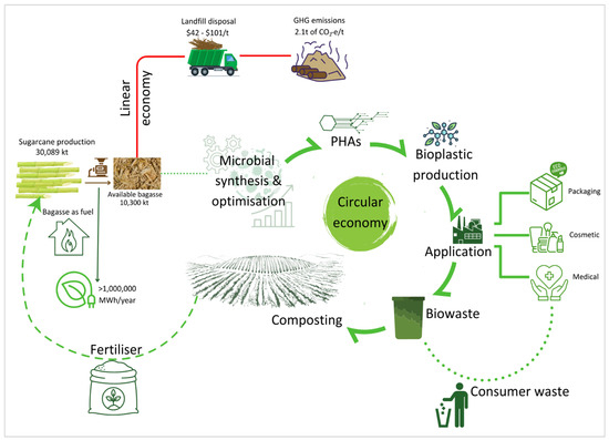 The diversion of this valuable resource away from landfills and into PHA production can create a closed-loop, circular economy model for bagasse in Australia and tropical and subtropical regions of the world. Bagasse can undergo biological processes to produce PHAs, which can be turned into environmentally friendly bioplastics. The desirable features of PHAs, such as mechanical properties, biocompatibility, biodegradability and non-toxicity, make them suitable for diverse applications across various sectors including but not limited to industrial, environmental, and biomedical sectors. The application of PHAs in industries involves their use for packaging. For example, a copolymer (poly(3-hydroxybutyrate-co-3-hydroxyvalerate)), marketed as BIOPOL® was produced by Imperial Chemical Industry Biological (ICI), London, UK, and used for the packaging of shampoo bottles and razors as well as disposable cups [161]. Another PHA, poly(3-hydroxybutyrate-co-3-hydroxyhexanoate)(PHBH), is industrially produced under the name of Nodax™ by Danimer Scientific, Bainbridge, GA, USA, and is applied in packaging carpet and compostable bags [38]. Due to its high filler loading ability, PHA can also be used with various natural fibre materials to develop biopolymer composites. For example, studies reported the use of PHB or PHBV with the reinforcement of SCB to produce PHA-based composites [162,163]. The biomedical application of PHA includes its use as a drug carrier, for implants, in tissue engineering, etc. [164]. In terms of environmental application, PHAs can be used as antimicrobial agents to control the outbreak of certain diseases. It has been reported that the use of PHB in aquacultures controls Vibrio infection in shrimp due to its antiadhesive property [165].