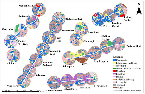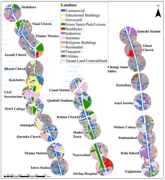 Moreover, for transit lines in Lahore, the stations are spaced at approximately 1 km intervals along the developed sections of the alignment to reflect passengers’ maximum walking distance of 500–600 m. Thus, we consider a 500 m (5 min walk) radius distance for the current study which will cover surrounding areas of both lines, and all indicators will be measured within this area.