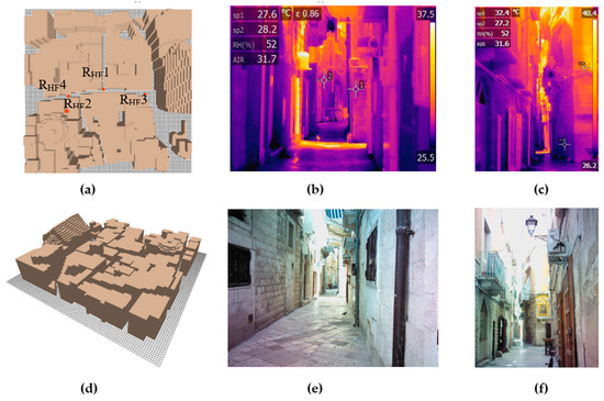 Figure 17a. This emphasizes that the use of meteorological station data, as already verified for HF, leads to a substantial underestimation of thermal dynamics in the RF within the built environment.