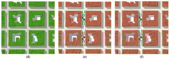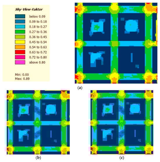 Figure 23a illustrates that the sky view factor (SVF) in RF_Base streets is quite high and allows the penetration of incident solar radiation at 12:00 a.m. There is a reduction in SVF in RF_GR (