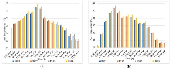 Figure 5b,c), the values recorded by the weather station have lower values than those measured, especially during the 12:00 a.m.–2:00 p.m. hours. In some cases, there is an increase in T