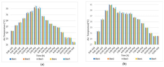 In the typical day, the air temperatures in the RF_BaseM scenario with measured climatic data are higher than the RF_Base scenario with data from the weather station (