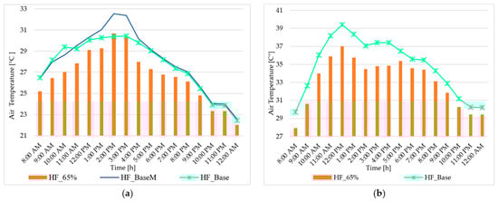 Figure 15). As can be seen from the false-colored maps, the streets analyzed are predominantly in the temperature range of 30.60 to 31.40 °C for HF_65% on the typical summer day, while for HF_BaseM, the temperatures are between 32.20 and 33.00 °C. On the hot extreme day, a similar situation occurs with regard to the reduction in temperature for HF_65% compared to HF_Base.