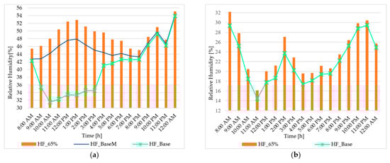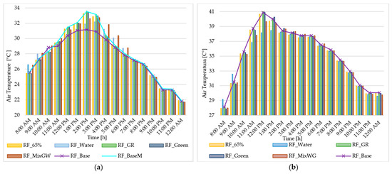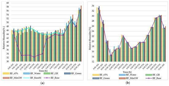 Figure 19) and increases with the presence of water jets and greenery (e.g., at 12:00 p.m., ΔRH is 1.37% in RF_Water and 0.08% in RF_Green versus RF_BaseM).