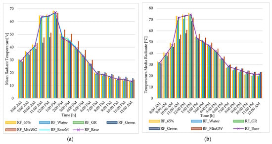 The increased albedo in RF resulting from the direct rays of the sun’s shortwave radiation, which bounces off the street and façades, impacts the comfort of objects and pedestrians from 11:00 to 15:00. The shading created by the inclusion of green (RF_Green) results in a maximum lowering of the average radiant temperature by 19.85 °C for the typical day (