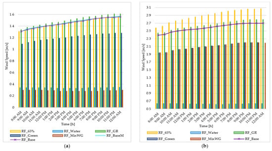 Figure 13). The wind speed graph does not change significantly between the HF scenarios because they make no changes to the surface of the urban canyons.