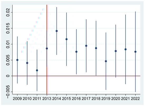 This paper’s explanatory variables are the result of multiplying the dummy variable for the year of the launch of the carbon emissions trading market and the dummy variable for pilot enterprises, represented by ‘did’. A value of one is assigned to enterprise i if it participates in the carbon emissions trading market in year t; otherwise, a value of zero is assigned. The pilot carbon market policy’s year is chosen as 2013; pilot companies are listed controlled emission enterprises.