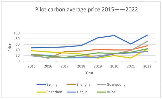 The effectiveness of the implementation of the carbon trading policy is closely related to the high and low prices of carbon emissions transactions. Cui et al. found that a higher carbon price provides greater incentives for firms to participate in carbon abatement [37]. Wei Lili et al. believe that when the carbon price is relatively high, the government’s responsibility includes maintaining the carbon price and encouraging it to be effectively raised within a reasonable range, and that effective management and guidance of the carbon price is conducive to strengthening the effect of carbon trading policy implementation [38]. Considering the differences in carbon prices in different pilot cities, this study examines the heterogeneity of policy effects by classifying the six pilot provinces into high and low carbon price categories based on the average carbon price of the pilot regions in 2015–2022 in the wind database (Figure 3), and classifying the pilot regions of the carbon trading policy into high and low carbon price areas based on the average price of carbon emission rights transactions. Among them, the high carbon price regions include Beijing, Shanghai, and Guangdong, and the low carbon price regions include Hubei, Tianjin, and Shenzhen. As a result, this study splits the policy interaction term in the baseline regression model into ‘did’high and ‘did’low policy interaction terms based on the two carbon price types mentioned above to examine the differential impact of carbon trading policies on the financial performance of firms in high and low carbon price regions, respectively. The analysis of carbon price heterogeneity is displayed in Table 10. The estimated coefficient of ‘did’high is 0.009, which is significant at the 5% level. This suggests that as the carbon price increases, the financial performance of enterprises is positively impacted by the carbon emissions trading policy. The possible reason for this is that the higher the carbon price, the more it can force enterprises to increase R&D investment and promote technological innovation, thus reducing costs and increasing revenues; at the same time, green technological innovation reduces the carbon emissions of the enterprise, which makes the surplus of carbon allowances increase, and thus improves the financial performance of the enterprise.