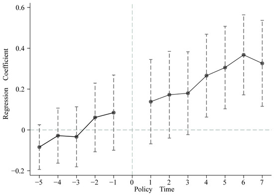 The results show that the regression coefficient of is significantly positive at the 1% significance level in all cases. It suggests the Chinese IPR model city pilot policy has promoted enterprises’ green technology innovation behaviors. In economic terms, the policy has resulted in a 16.01% () increase in green invention patents relative to the level of non-IP pilot cities. In Column (5), the coefficients on both firm size () and government subsidies () are significantly positive at the 1% level. These results suggest that firm size and government subsidies positively influence the level of firms’ green technology innovation.