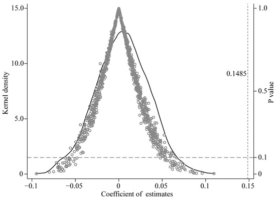 We performed a placebo test by randomly selecting the treatment group from the sample. First, we used Stata 15.1 software to randomly select 492 of the 849 sample firms as the treatment group, and the policy time was also randomly given. Subsequently, the process was repeated 1000 times to obtain 1000 sets of policy dummy variables (). Finally, the kernel density and p-value distributions of are presented in Figure 2. We find that the estimated coefficients are concentrated around zero, which is much smaller than the actual estimate of 0.1485. Most p-values were also above 0.1 and statistically insignificant. This demonstrates that omitted variables do not impact the estimation results and baseline regression results are robust.