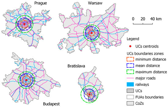 Configuration of the boundaries of the FUAs, their UCs and CoZs, and the transport network. The dotted lines represent the UC boundary distance to the zone’s centroid. The orange dotted line represents the minimum distance, the green dotted line, the maximum distance, and the blue dotted line, the mean distance. Global Roads Open Access Data Set [43] was used to visualize the roads and UA data for the railways.