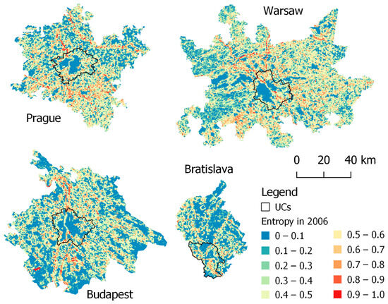 As the ENT and SIDI are spatially compatible, we decided to present only the spatial distribution of ENT values derived from LULC data. The spatial distribution of ENT values in the BSUs for the first period, that is 2006, is shown in Figure 3. Low values of the ENT of 0–0.1 are found in the centre of UCs, demonstrating that UCs have a homogeneous LUM dominated by artificial surfaces. In CoZs, values 0–0.1 of the ENT in clustered BSUs are found in areas dominated by such LULC classes as Class 2 (agricultural areas, semi-natural areas, and wetlands) or dominated by Class 3 (forests). The ENT of 0.5–1 is evident near transport networks in CoZs. In fact, high ENT values (0.8–1) overlay main transport routes.