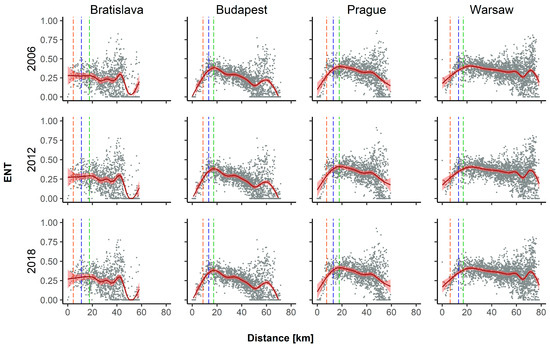 ENT values for LULC classes on the first Urban Atlas nomenclature level averaged by distance in Bratislava, Budapest, Prague and Warsaw in 2006, 2012 and 2018. The red lines are generalised additive models with integrated estimated smoothness. The transparent red around the solid line is the interval of ±3 standard deviations. The dotted lines represent the UC boundary distance to the zone’s centroid. The orange dotted line represents the minimum distance, the green dotted line, the maximum distance, and the blue dotted line, the mean distance.