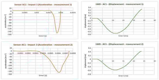 From the point of view of the nature of the dynamic action, it is an impact load. These occurrences happen quickly, so the graphical depiction will display values in seconds (s) or milliseconds (ms) on the time axis. All measurements were implemented in the form of a series of single pulses, initiated using a weight of 10 kg. In the loading apparatus, the weight fell from a specified height (determined by the calibration of the apparatus) directly onto the circular surface of the LDD 100. A total of 12 series of measurements were performed during the entire experimental measurement campaign. Each of them contained at least three input pulses from the loading device. An example of one series of measurements at the AC1 input is demonstrated in Figure 9.